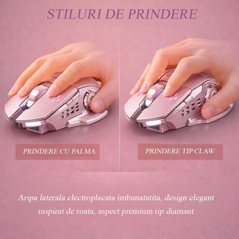 Modelul are design ergonomic si dimensiuni de 138x80x38 mm, fiind usor de manevrat in utilizarea zilnica. Este echipat cu sistem fotoelectric, acumulator reincarcabil si are o durata de viata a butoanelor de pana la 20 de milioane de apasari. Culoarea roz ii ofera un aspect modern si placut, iar greutatea bruta a produsului este de 160 g.