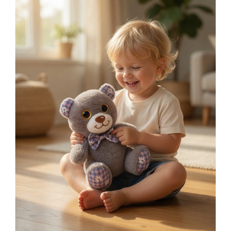 Realizat din pluș catifelat ultra-moale, acest ursuleț oferă confort maxim și este testat pentru siguranța copiilor de la 0 luni. Fundița maro chic și ochii mari, expresivi îi conferă o personalitate drăgălașă care captivează imediat micuții.
