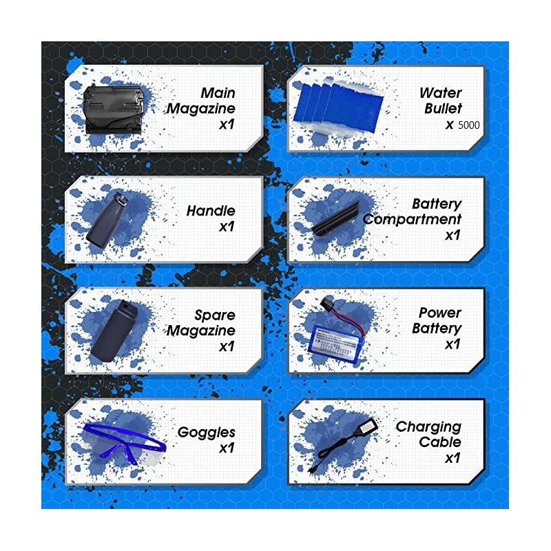 Design perfect si accesorii usor de montat cu o baterie din litiu care va oferi viteza fiecarei bile. Setul contine cele 5000 de bile dar si o pereche de ochelari de protectie pentru siguranta. Este o jucarie perfecta pentru baieti, fete si adulti . Blasterul cu bile de gel este o jucarie care lanseaza bilele fragile de gel care se sparg cu usurinta in multe bucati minuscule. Poate trage 3 picaturi de margele de apa pe secunda pe o distanta de pana la 15 metri.