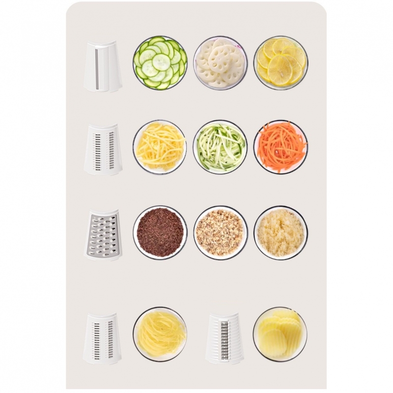 Această răzătoare rotativă multifuncțională 5 în 1 este echipată cu 10 lame interschimbabile din oțel inoxidabil, oferind multiple opțiuni de tăiere pentru diverse tipuri de alimente. Sistemul anti-stropire și capacul de protecție pentru degete contribuie la o utilizare sigură și curată, chiar și în timpul preparării intensive.