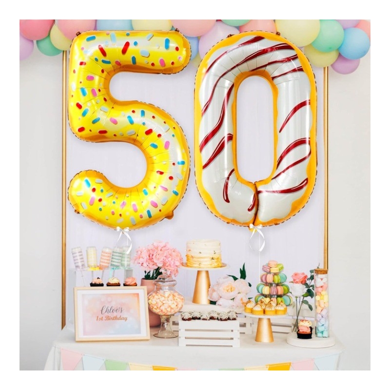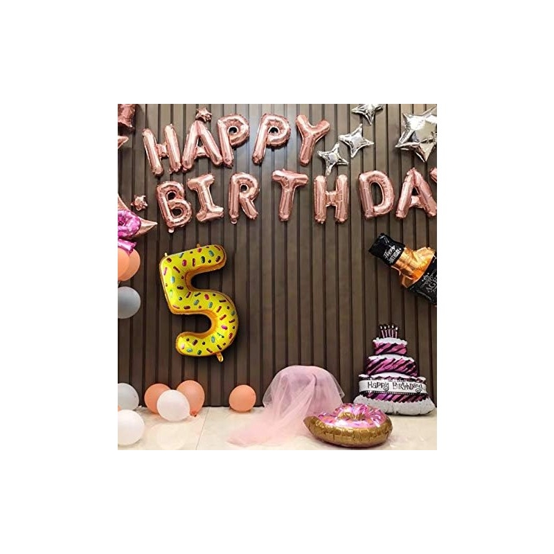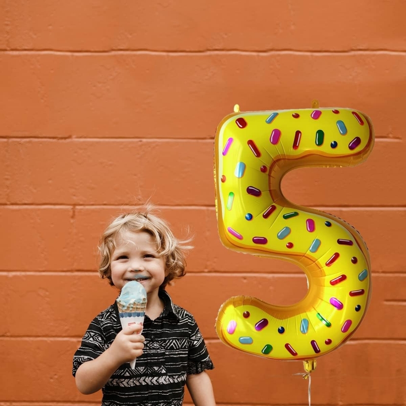 Balon din Folie Metalizata, Figurina Cifra, Imprimeu Gogosi, Tema Aniversare 100 cm, Ambalaj Individual, Pai inclus, Umflare cu Aer sau Heliu, Multicolor, Cifra 5