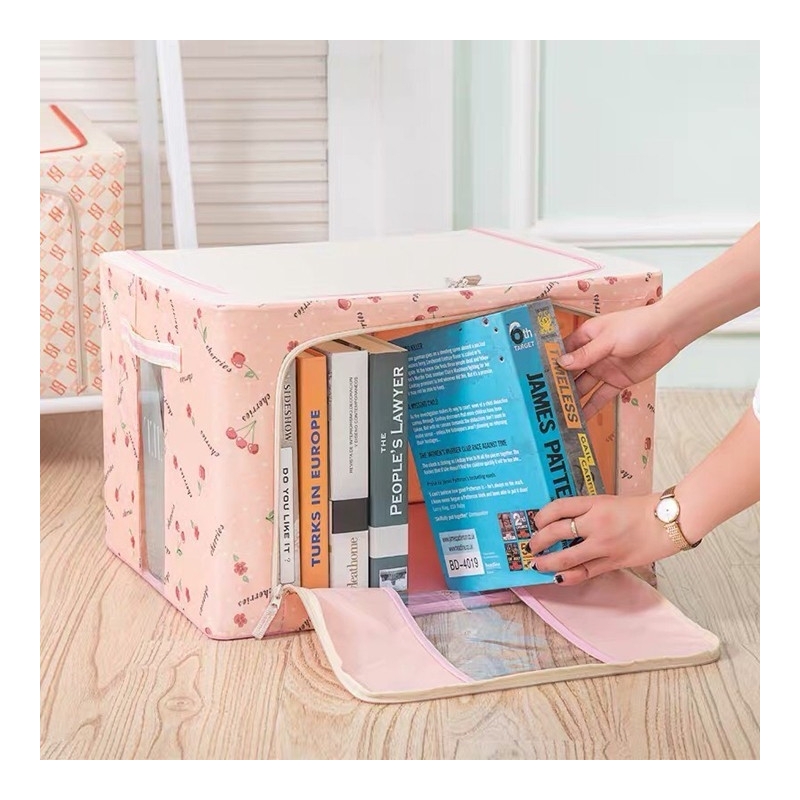 Cutie de Depozitare Pliabilă, Cu Fermoar Bidirecțional, 24 L, Pânză Oxford, 40x30x20 cm, Fereastră Frontală, 2 Uși de Acces, Cadru Metalic, Suport Bază Stabil din Plastic, Imprimeu Cireșe, Roz