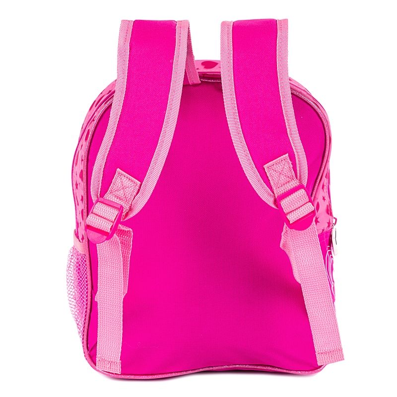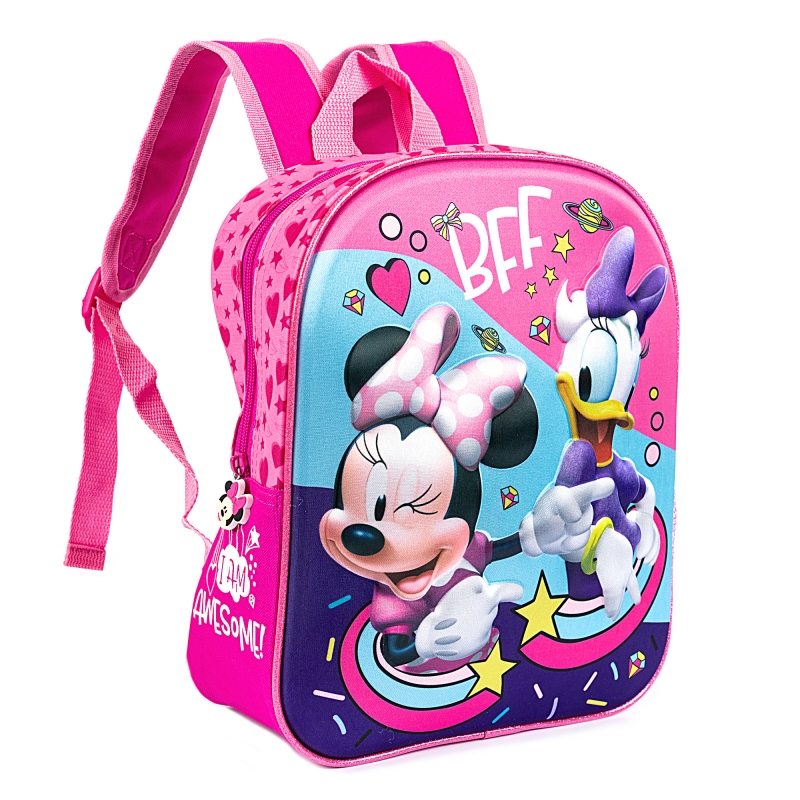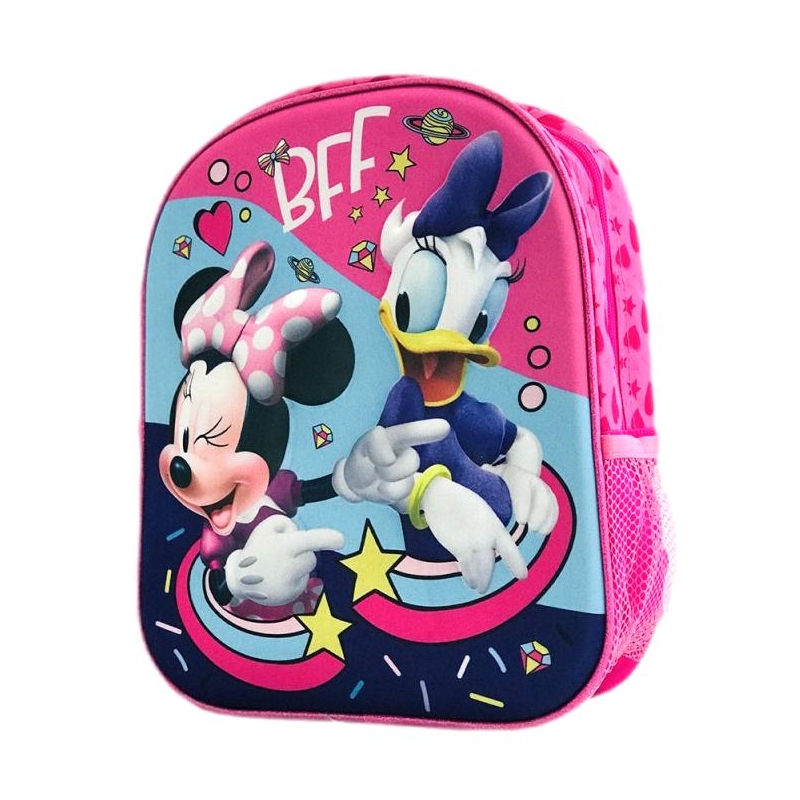 Ghiozdan 3D Minnie cu 1 compartiment mare prevazut cu fermoar, 1 buzunar lateral, bretele buretate si reglabile. Fermoarul este accesorizat cu personajele in miniatura.