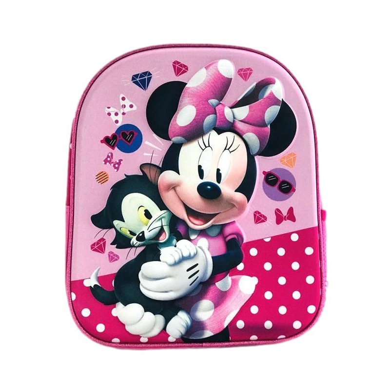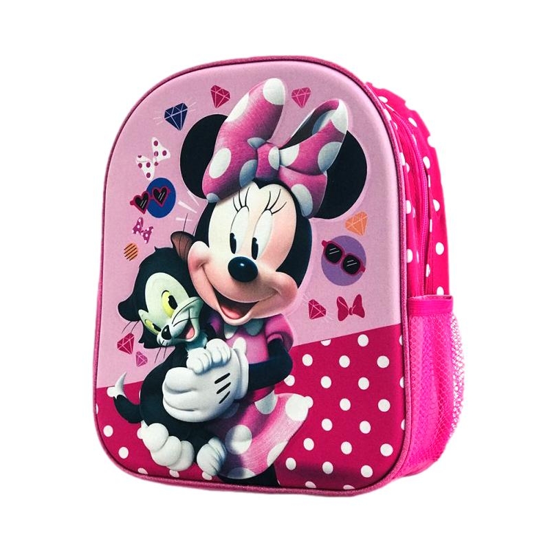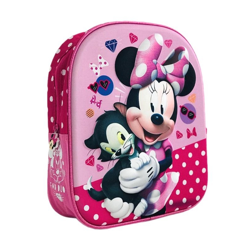 Ghiozdan 3D Minnie cu 1 compartiment mare prevazut cu fermoar, 1 buzunar lateral, bretele buretate si reglabile. Fermoarul este accesorizat cu personajele in miniatura.