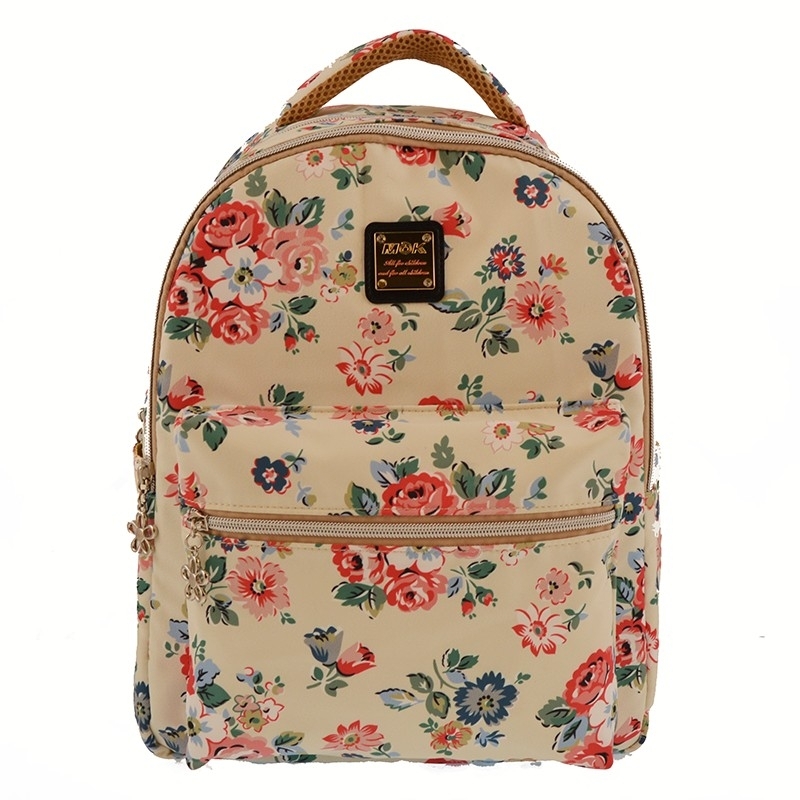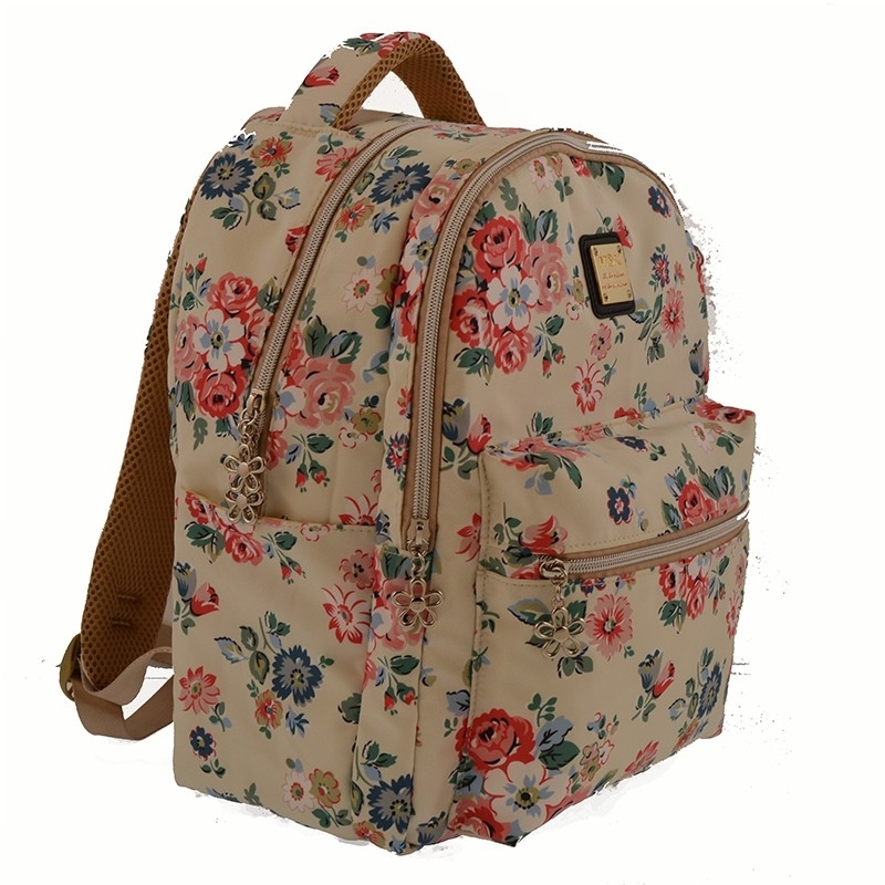 Rucsac mediu textilcu 2 compartimente de diferite dimensiuni ce au deschidere cu fermoar, compartimentulmare este dotat cu 1 buzunar cu protectie pentru laptop si separator interior si 1 buzunar mic prevazur cu fermoar. 1 buzunar mediu frontal cu fermoar, partea din spate a acestuia este buretata, bretele late, buretate si ajustabile si 2 buzunare laterale. Fermoarele sunt metalice cu flori.