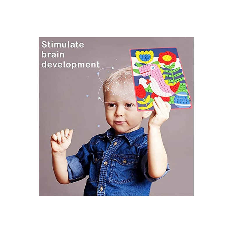 Joc creativ tip mozaic cu patru imagini pe care copilul le alcatuieste pas cu pas, lipind in locurile marcate piesele pretaiate din spuma.