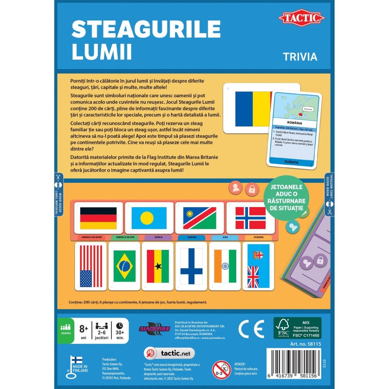 Porniti Intr-o calatorie In jurul lumii si Invatati despre diferite steaguri, tari, capitale si multe, multe altele! Steagurile sunt simboluri nationale ce pot uni oamenii si pot comunica atunci cand cuvintele dau gres. Jocul Steagurile lumii contine 200 de carti de joc, pline de informatii, Intrebari fascinante despre diverse tari si caracteristicile lor principale, dar si o harta a lumii. Steagurile lumii este un joc educativ tip Trivia, ce se poate juca in 2-6 jucatori Incepand cu varsta de 8 ani.