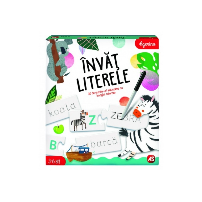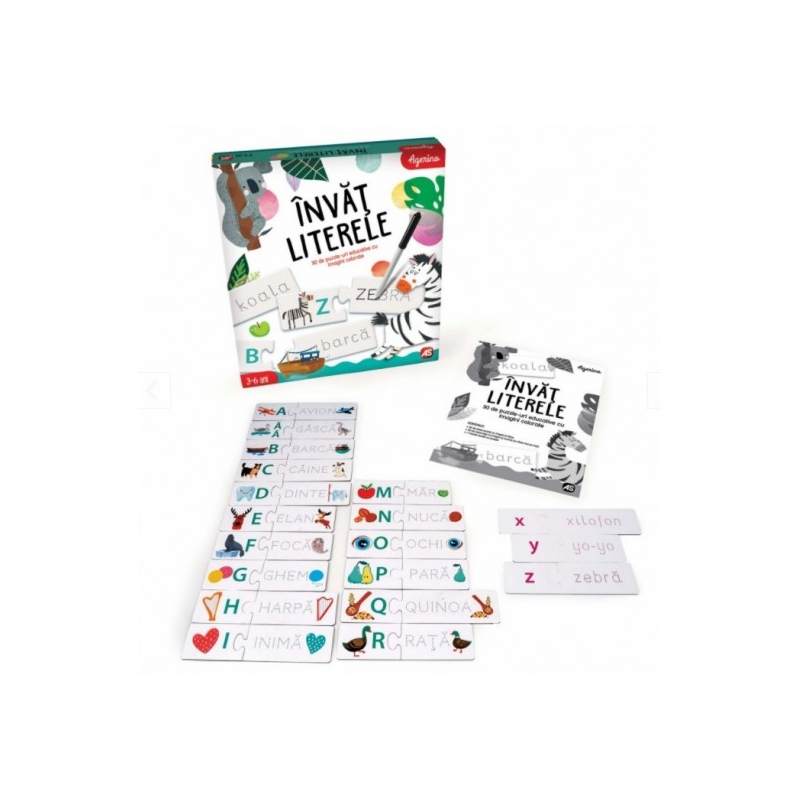 INVAT LITERELE este un joc educativ progresiv, bazat pe corespondenta dintre litere, imagini si cuvinte, de pe cele doua parti ale cartonaselor, pentru a-i invata pe cei mici sa scrie si sa citeasca. Copilul observa cu atentie imaginile, identifica litera de pe piesa de puzzle si incearca sa gaseasca cuvantul corespunzator. Dupa ce uneste toate piesele de puzzle, copilul incearca sa scrie cuvantul de pe fiecare cartonas (cu litere de mari pe fata si cu litere mici pe verso). Astfel, prin joc si exercitii simple, copilul invata foarte usor literele mari si mici ale alfabetului, asociindu-le cu elemente a caror denumire incepe cu literele respective, antrenand scrierea cuvintelor, tinerea corecta a instrumentului de scris, dezvoltandu-si miscarile fine ale mainilor.