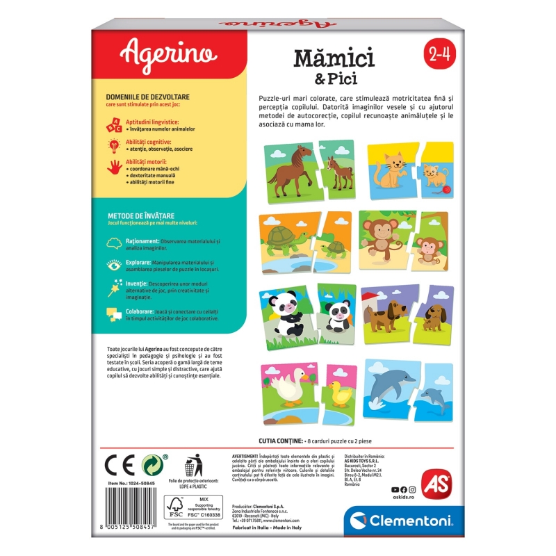 Joc educativ " Mamici si Pici" este un joc educational distractiv, special conceput pentru copiii foarte mici. Acesta contine carti colorate de dimensiuni mari, care au o forma speciala pentru a fi usor de prins si sunt foarte rezistente. Prin intermediul imaginilor vesele, copilul invata despre animalute, precum si despre mamica lor. In timp ce se joaca, copilul isi exerseaza abilitatile motorii si isi dezvolta logica si capacitatea de observatie.
