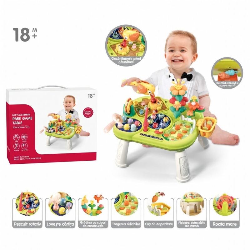Masuta include diverse activitati captivante precum joc de pescuit, lovire cu ciocanelul, extragere morcovi, plantare gradina si elemente interactive care incurajeaza explorarea si curiozitatea copilului. Aceste functii contribuie la dezvoltarea coordonarii mana-ochi, a dexteritatii si a gandirii logice.