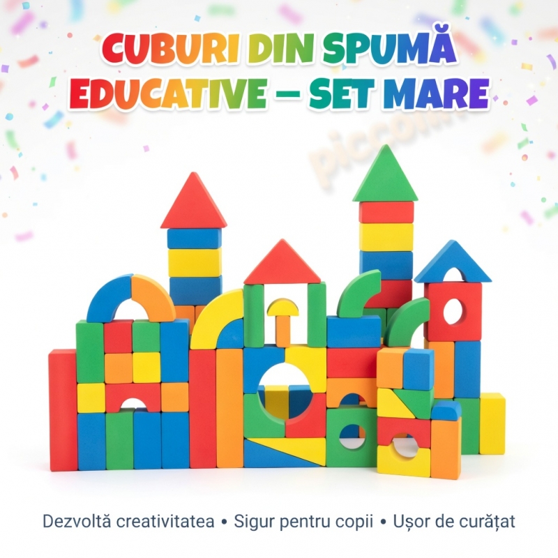 Acest set mare de cuburi moi este o jucărie excelentă pentru construcție creativă și joacă sigură. Fabricate din spumă EVA moale și impermeabilă, cuburile sunt perfecte pentru bebeluși și copii mici, deoarece nu dor la impact și oferă o experiență tactilă plăcută.