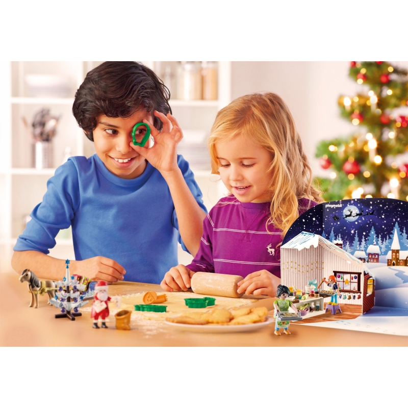 Mirosul prajiturilor de Craciun se simte in aer! Intreaga familie coace impreuna fursecuri de Craciun si se pregateste pentru vizita lui Mos Craciun. Include taietor de prajituri si stampila pentru prajituri, pentru a coace si decora prajituri de Craciun. Mirosul de fursecuri este in aer! Participa la distractia de sarbatori cu Calendarul de Craciun - Brutarie. In spatele fiecareia dintre cele douazeci si patru de usi se afla cate o piesa surpriza pentru fiecare zi pana la Craciun. Odata ce toate piesele sunt dezvaluite, coaceti niste fursecuri delicioase in bucataria mare cu doua cuptoare si apoi puneti-va palaria si manusile inainte de a merge afara pentru a construi un om de zapada. S-ar putea chiar sa apara un vizitator special in costum rosu si sanie! Creeaza-ti propriile prajituri cu cele trei forme de prajituri de dimensiuni mari si stampila pentru prajituri. Setul include: 3 figurine, Mos Craciun, sanie, om de zapada, accesorii de bucatarie si multe alte decoratiuni de sarbatori. Imi plac jucariile PLAYMOBIL pentru ca totul este atat de real. Imi place mult sa-mi creez propriul scenariu de joc cu figurine. Da, este foarte distractiv. " un mic fan PLAYMOBIL Din 1974, sistemul de jucarii PLAYMOBIL, creat de Hans Beck, a devenit un clasic al locurilor de joaca pentru copii, cu numeroasele sale lumi creative - de la o nava cu pirati la un spital pentru copii. Circa 3,5 miliarde de figurine cu zambetul caracteristic au fost produse de atunci si incanta copiii din intreaga lume. Aproximativ 40 de scenarii de joc sunt distribuite in aproape 100 de tari de pe glob. Atat parintii, cat si educatorii apreciaza sistemul de jucarii PLAYMOBIL ca fiind un reprezentant al jocului creativ de inalta calitate. Joc creativ de rol cu PLAYMOBIL Principiul unic de joc stimuleaza imaginatia si creativitatea, promovand dezvoltarea copilului. PLAYMOBIL aduce o lume in miniatura, in care copiii pot interpreta diferite roluri, pot crea sau reproduce povesti, aventuri si situatii din viata reala. Cu multiple talente, aceste figuri vesele depasesc cu succes tot felul de provocari spre exemplu cavaleri sau pirati in scenarii istorice, ca muncitori in constructii, veterinari si politisti din lumea de azi sau ca agenti secreti in lumi virtuale. Oamenii creativi de la PLAYMOBIL vin in mod constant cu idei si completari noi pentru a le oferi celor mici de pretutindeni distractie de lunga durata.