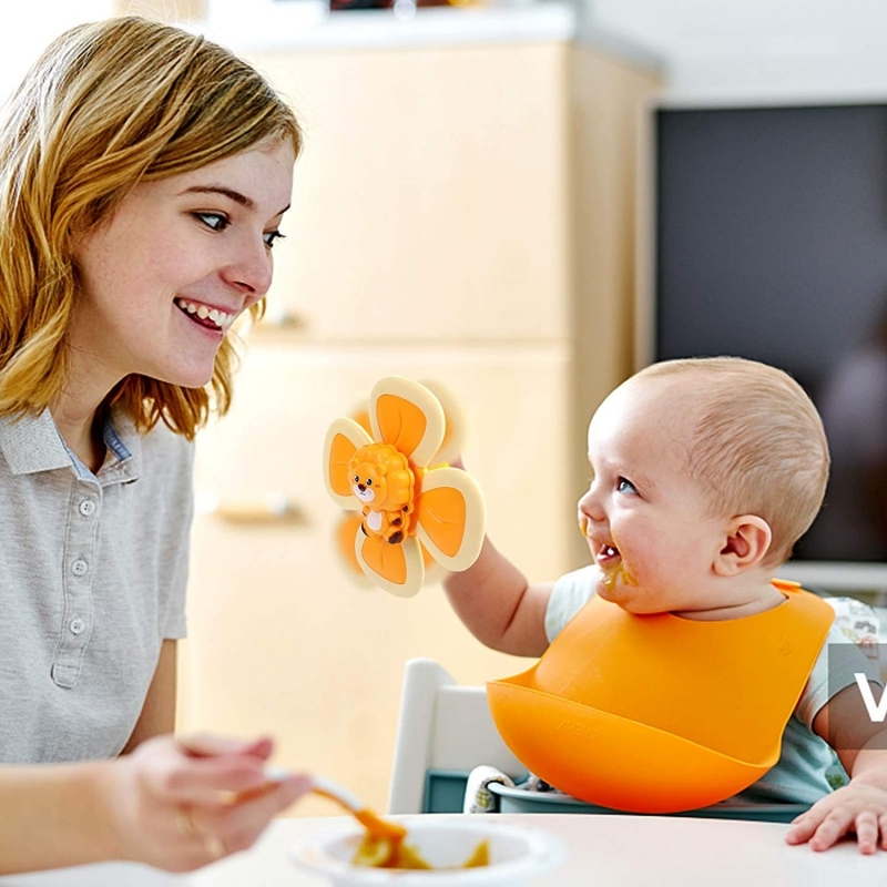 3. Diferite moduri de utilizare: Poate fi folosit pentru a-i distrage atentie in procesul de obisnuire cu o noua activitate( se poate atasa de scaunul de masa pentru bebe). Se poate juca singur, fiind o jucarie sigura, fara parti care pot fi desprinse.