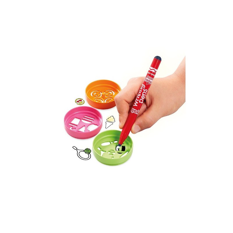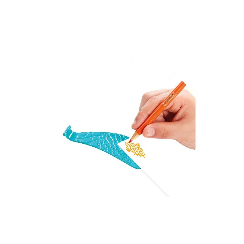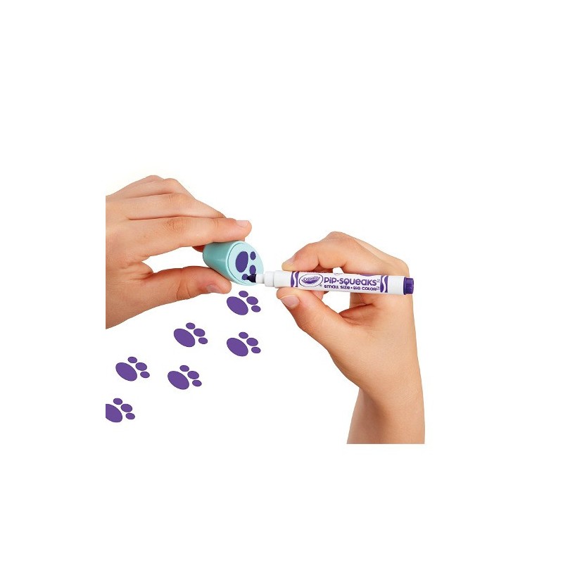 Include stampile in forma de labute si codite, sase sabloane, 2 rotite si un cadru circular pentru a crea modele in spirala, 2 palete, 1 carioca Crayola, 6 creioane si 1 Pipsqueak Skinny.