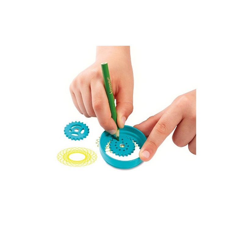 Deschideti compartimentul si descoperiti sabloane, stampile, paleta si diverse unelte pentru a crea desene in spirala uimitoare.