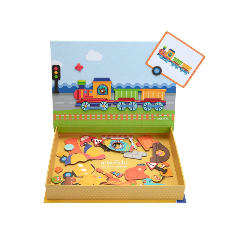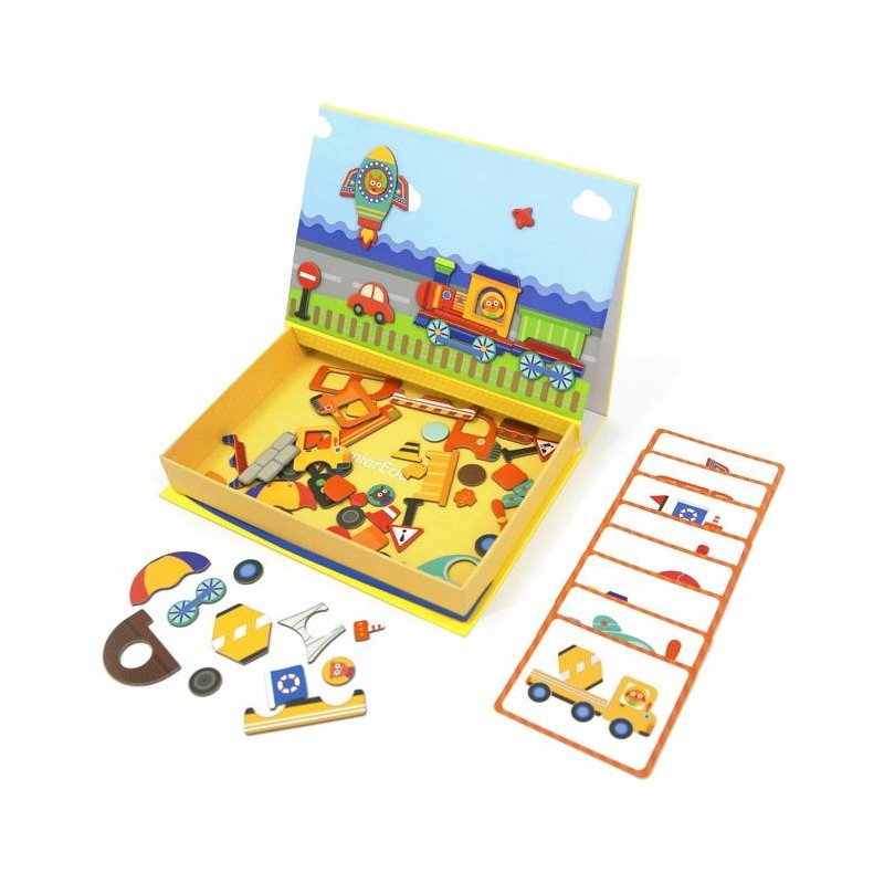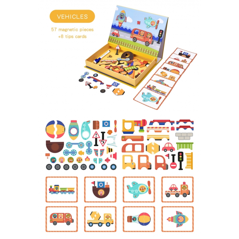 Joc educativ magnetic într-o carcasă pe tema vehiculului pentru a stimula imaginația copiilor și a-i inspira pe cei mici să creeze propriile povești folosind magneți.