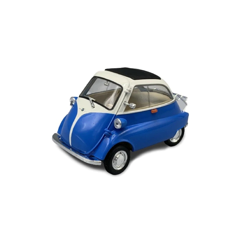 Model detaliat al unui vehicul model BMW Isetta din 1955 cu uși care se pot deschide și roți libere.