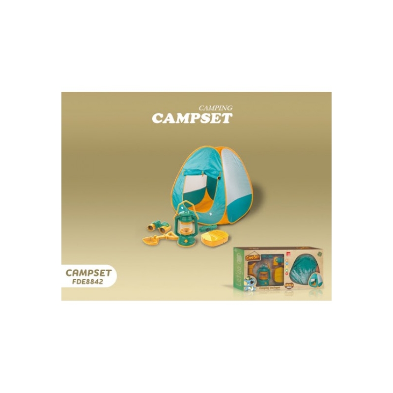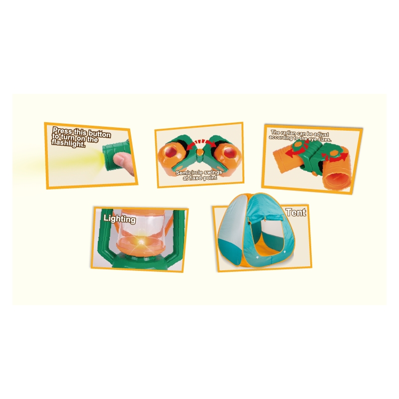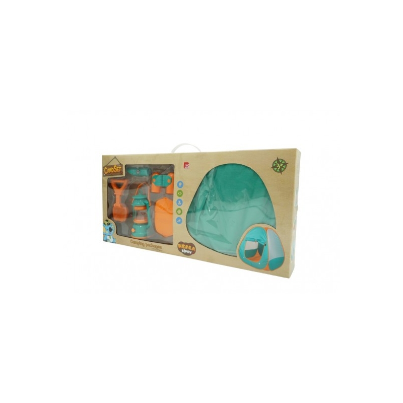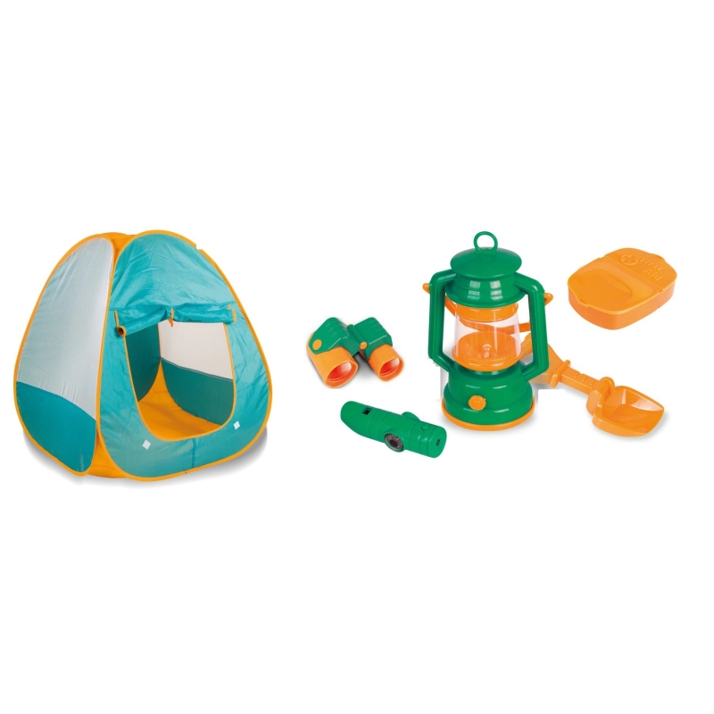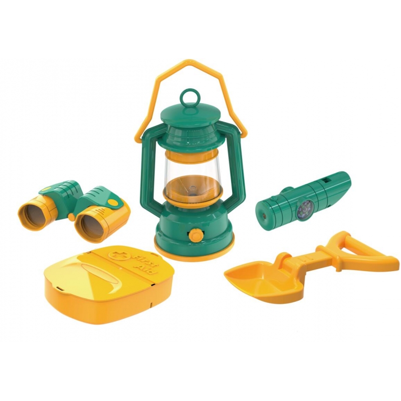 Acest set este jucaria potrivita pentru toti micii aventurieri carora le place sa exploreze natura. Setul include toate instrumentele necesare pentru un camping reusit: Cort, telescop, lampa pe ulei, set de prim ajutor, lopetica si un fluier multifunctional cu lanterna si busola.