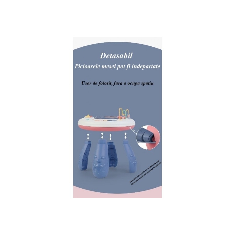 Masa educativa pentru copii cu accesorii, este o masa cu multiple jocuri si functii care ii vor capta atentia copilului tau pentru mult timp. Aceasta poate fi folosita atat ca si masa, cu picioarele atasate, cat si ca o tabla cu activitati de dimensiuni mici, putand fi transportata cu mai multa usurinta.