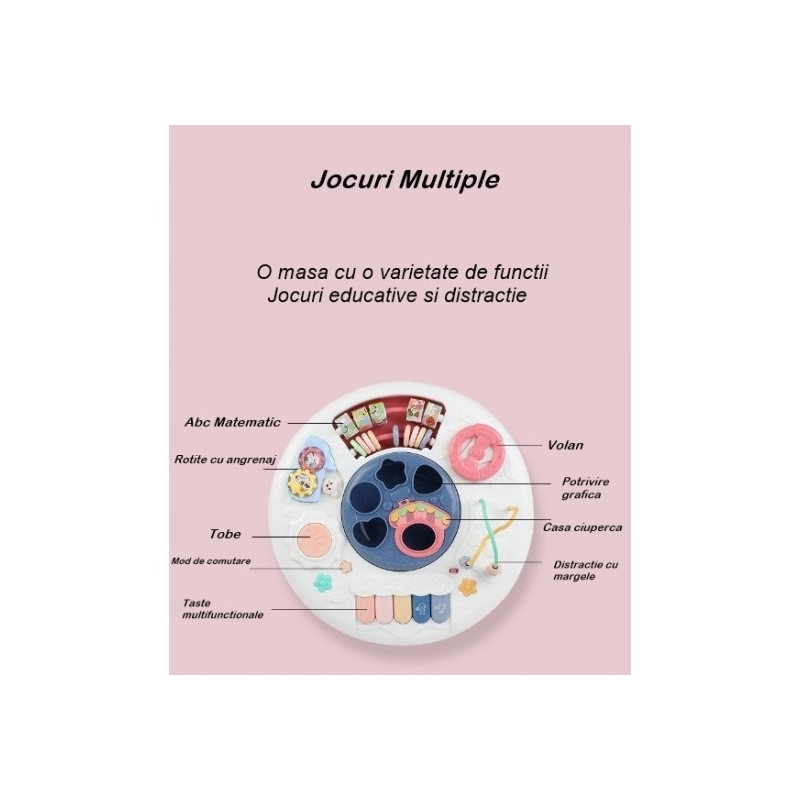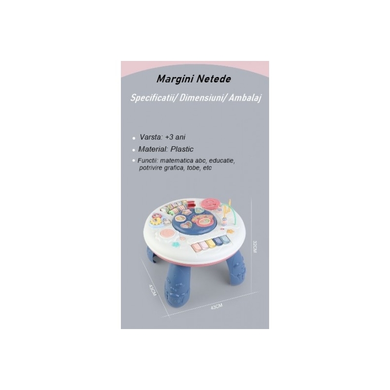 Functiile mesei il vor ajuta pe cel mic sa isi dezvolte cele mai importante abilitati cognitive cum ar fi atentia, creativitatea, memoria, potrivind cuburile in formele regasite pe masa, distrandu-se cu partea de abc matematic, sau cu tastele multifunctionale.