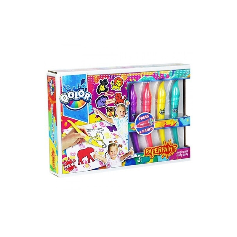 Qolor Jungle Party contine 4 pensule de culori diferite si sabloane de colorat cu animale din jungla.