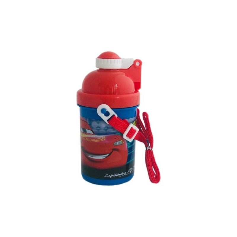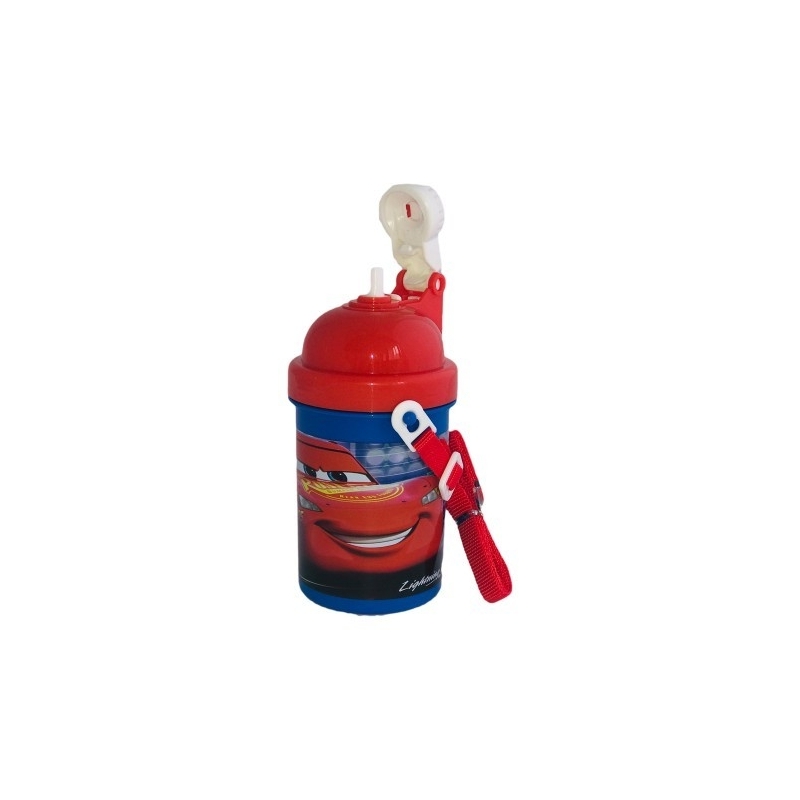 Termos plasticu capac si pai ce se actioneaza prin apasarea unui buton, cu siret reglabil si detasabil.